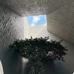 🌟 The shop's décor combines a Brutalist and Loft style with exposed concrete structures and a cool, raw gray tone. There are both indoor and outdoor areas, with a refreshing centerpiece of trees.