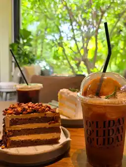 #GetDiscountsWithoutLuck The O'liday Cafe is newly opened, but it's always packed. Even on weekdays, it's almost full. The cafe is quite large, with a spacious garden and a waterfall. I really like the large, shady trees. It seems they've divided the cafe into sections, a burger joint, and a restaurant. Outdoor seating is available with misting fans. Inside, the air conditioning is cool and refreshing. The coffee here is delicious. The coconut cake is soft and smooth, not too sweet. The large almond coffee cake is delicious and not too rich. Overall, the atmosphere is great, with a great feel. The atmosphere, drinks, and desserts are perfect.