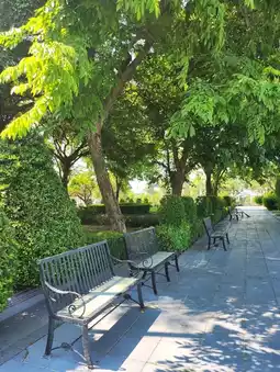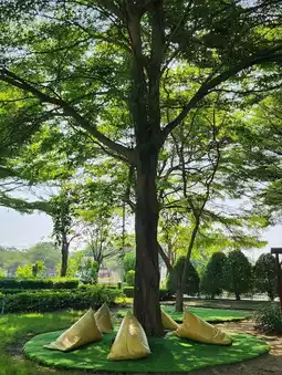 The cafe is decorated in a minimalist style. The surrounding area is shady. There are many seats. It is suitable for sitting and sipping coffee and relaxing.