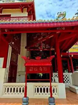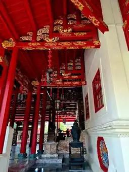 Upstairs, the bedchamber of King Chulalongkorn (Rama V) is carved with gilded Chinese dragon designs. A Chinese plaque bearing the names of King Mongkut (Rama IV) and Queen Debsirindra (Rama V), symbolizing respect for ancestors in accordance with Chinese tradition.