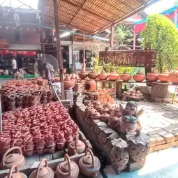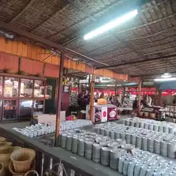 The market sells pottery products, traditional desserts, organic plants, vegetables, and fruits from community gardens, consumer goods, and various types of savory and sweet foods.