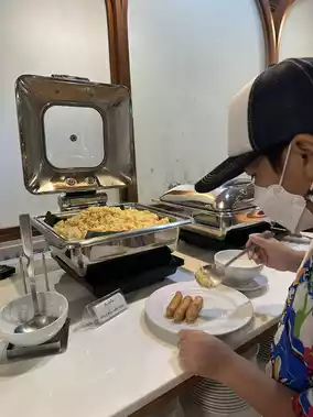 - Food: Fried rice/spaghetti on alternate days, soup, salad bar, bread, sandwiches, soy milk, Thai dessert (Thong Yip), sliced fruit, ice cream