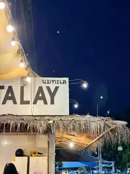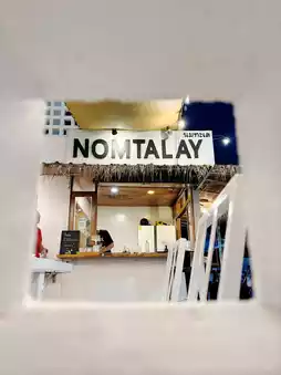 We found a restaurant called Nom Talay. It has a very beachy feel, with a white theme and a touch of safflower on the roof. It's always packed with customers, with the place filling up. They told us it's been open for quite some time.