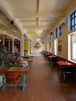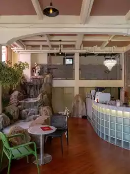 A newly opened vintage-style cafe and restaurant in the Charoen Krung area, renovated from an old building. The shop features a vintage décor and a waterfall, creating a classic atmosphere. The shop has two floors of seating: the first floor is a cafe area, while the second floor is a restaurant area. There's also a live DJ.