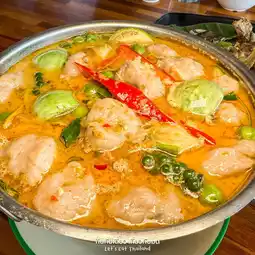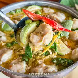 #Green Curry with Striped Catfish 250 baht Served in a hot pot The catfish meat is well-massaged, crispy, and bouncy.