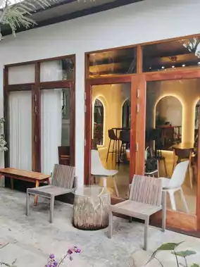 It has a Japanese feel, a nice, shady atmosphere, and plenty of photo spots. There's both indoor and outdoor seating. It's quite crowded, but the cafe has plenty of tables, so there's plenty of seating. There's also ample parking in the spacious lot right in front of the shop. The coffee and matcha are reasonably priced.