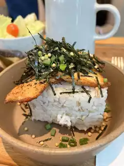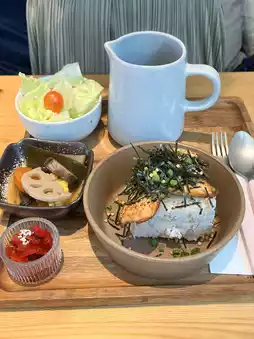 Otama Sunrice Cafe, a homemade Japanese-style cafe in Bang Yai, Nonthaburi, stands out with its warm, minimalist atmosphere, accented by wood and white tones. The menu features freshly made dishes with attention to detail, such as the Salmon Ochazuke, Oyako-don, and Croffle Pizza, each crispy on the outside and soft on the inside.