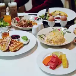 🍳🍞🥗Breakfast, book and choose 09.30 as a set, but you can skip it. You can order only once. You can order as much as you want. While waiting, the cute staff brought snacks to fill your stomach. I like waffle 🧇 and Pad Thai with shrimp because I like it personally.