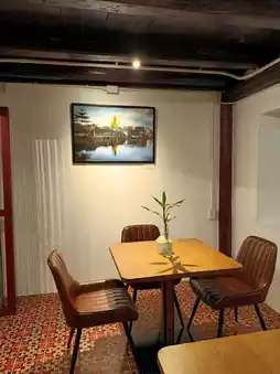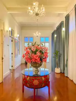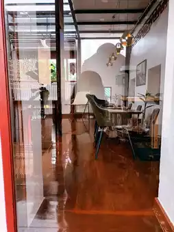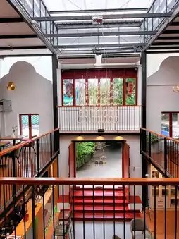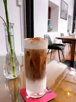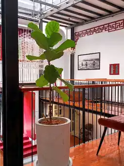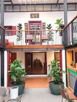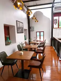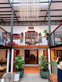 Another check-in point at Talat Noi. It has only been open for about 2 months. The actual place is very beautiful. I highly recommend it. It's very fun to take pictures. There is a cool cafe in an ancient Chinese house that has been renovated. The shop is outstanding with a very beautiful chandelier. The shop is decorated with photos of various places in Bangkok. The white and red tones are very compatible. The coffee is also very delicious. 🌹