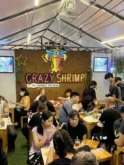 The decoration is in the style of a fair, a white tent. The area is not crowded, but there are a lot of people. The later it gets, the more people there are, making it look crowded.