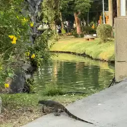 The atmosphere here is shady with a beautiful garden. Feel refreshed, sit near the water, cool breeze, comfortable, real nature therapy.