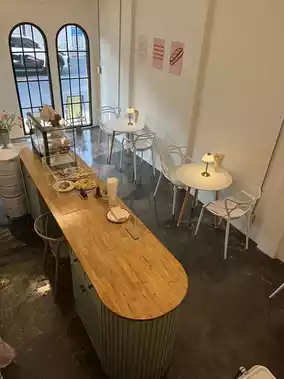 The photo corner will be a table with a poster of the shop in a light pink tone, very minimal, and there is also a fun mirror for taking more photos. If you come to the shop in the morning or afternoon, there will be light coming in through the glass in front of the shop, making for beautiful photos.