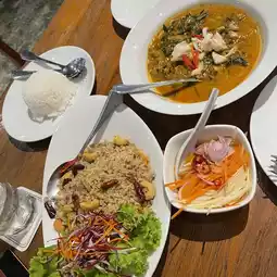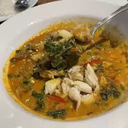 - Crab curry with betel leaves, the curry tastes strong, rather salty. You have to eat it with rice to get the right taste. The crab is served in large chunks, so it’s quite fresh. It’s delicious and has a lot of ingredients (275 baht).