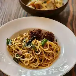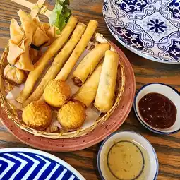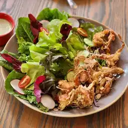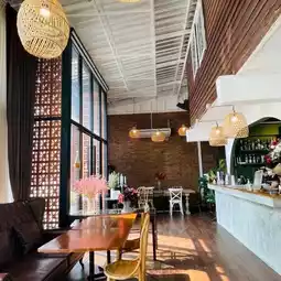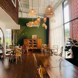 Newly discovered. Cozy Cafe with home cooked recipe. The décor feels like a tearoom with antique wooden furniture and a sloping ceiling overhead with bamboo lamps. Fusion dishes include favorites like spaghetti Thai sausage, vietnamese noodle, spring rolls, Thai spicy salad, etc.