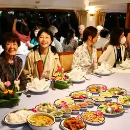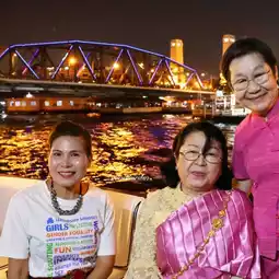 Today, we will take you on a cruise to see the view on both sides of the Chao Phraya River, along with dinner to enjoy the beautiful atmosphere of architecture, buildings, and houses, following the heritage of Siam. The boat we are sailing on the Chao Phraya River today is called "Angsana", which means the Paduak flower, which is the flower of the Royal Thai Navy. In the past, this boat was used to receive royal family members and important people of the country before being adapted into each area to be a cruise ship to support social gatherings. The highlight of the Angsana is its luxury and complete facilities, including the service and the most reliable safety system.