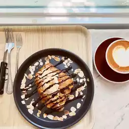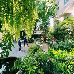 The landmark is the entrance door that looks like an archway, along with a menu sign in front of the shop. When you walk into the shop, there are 2 sections: Indoor (in the building) and Outdoor (in the garden).