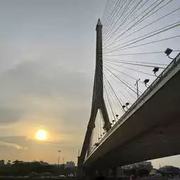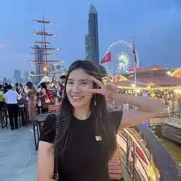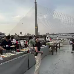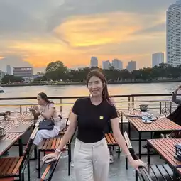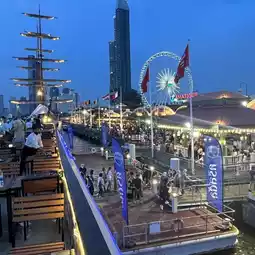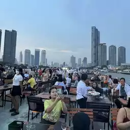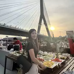 We received our boat tickets and boarded the boat at Asiatique Pier, Charoen Krung Road. The boat has 3 floors. When we arrived, it was still hot. The staff let us sit and wait on the 2nd floor, which is an air-conditioned room. They served us a welcome drink, Butterfly Pea Flower Juice. As for the food, the service on the rooftop (3rd floor) has a variety of choices, including Thai and international buffet, including unlimited beer and fresh grilled seafood, river prawns and grilled mussels. You can eat all the time. For dessert, there are cakes, Thai desserts and fruits. The taste is delicious. Listen to live music and singers. The first part is classical music. After the fun and lively music, the boat will sail from Asiatique to Rama VIII Bridge and then turn around to return to Asiatique.