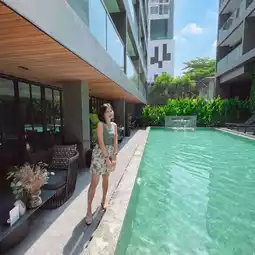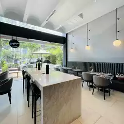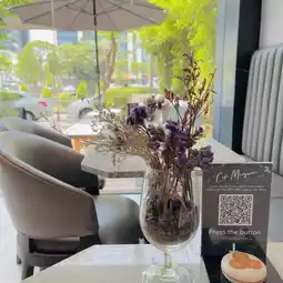 Modern atmosphere, black and white tones 🤍🖤 Sit and chill in the air-conditioned room or outdoor area connected to the lobby of the boutique hotel. It's great. You can choose to sit by the pool 🏝️⛲️