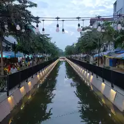 At night, Khlong Ong Ang is decorated with lights, attracting tourists. There are many restaurants selling food. The must-try is Saphan Han Kuay Chap, which is considered a must.