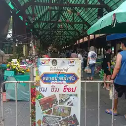 📍 From using the BMAFeeder transportation service of Bangkok today, starting at Bang Khun Non BTS Station, Exit 2, the car will take us to the second floating market, which is Taling Chan Floating Market, which is right next to the Taling Chan District Office.
