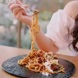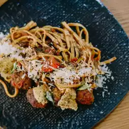 - Pasta Spicy Meatballs Fresh pasta in spicy sauce, served with meatballs mixed with pork and lamb.