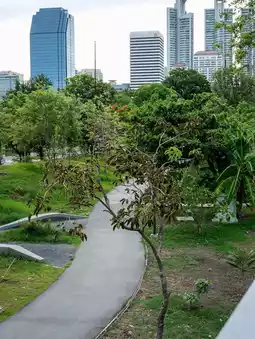 The new phase of Benjakitti Park is a great place to visit in the evening, just before sunset. The atmosphere is beautiful, and the park spans hundreds of rai. It's incredibly spacious, and the skywalk is lit up, making it especially beautiful at dusk. The park closes at 9:00 PM, and there's ample parking available.