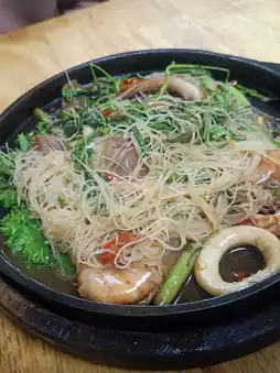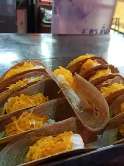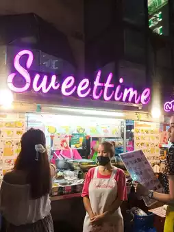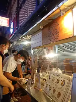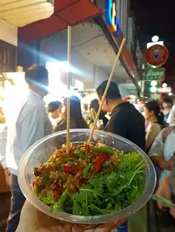 🌼 The atmosphere is lively with people going out at night. It is a popular food source for teenagers and working people who like to search for delicious food at night. There are many restaurants, almost all of which are delicious, including old and famous ones that have been around for a long time and are popular. If you can't think of a menu, follow us. When we arrived, we were hungry and had grilled squid with delicious dipping sauce. Then we went to have a heavy meal at the famous restaurant, Por Lamai. We recommend the boiling seafood noodles and morning glory. We were going to try Nai Ek's Kuay Chap, but there were so many people and the line was long, and we were starting to get full. So we decided to try Man Man's dessert instead of ice cream, followed by Khanom Bueang, and finally, the young coconut pudding from Sweettime. When you go here, you need to bring money and walking shoes because you will be walking around eating and tasting until you are engrossed in Thai street food. This is another place you have to go and go again.