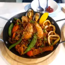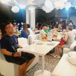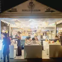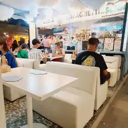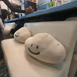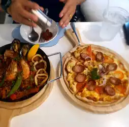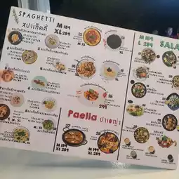 We recommend you to try this restaurant. It is an eye-catching Italian restaurant. The shop is decorated cutely in a cloud theme, white, clean and comfortable. It is located in Jod Fairs Dan Neramit Market, opposite the Sleeping Beauty Castle. It is at the end of the inner market near the lake. It is not hard to find. The recommended menu is an 8-inch pizza. You can choose the toppings. The dough is thin and crispy. The price starts at only 159 baht. Another recommended menu is Spanish fried rice, which is not easy to find. We recommend you to try it. It is very delicious. Other menus that people order a lot are spaghetti with white sauce. But we didn't take a picture in time. Let's come. You won't be disappointed at Jod Fairs Dan Neramit Market.