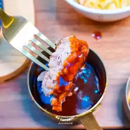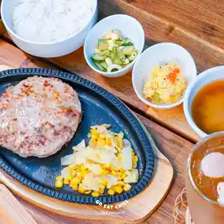 This is the 🐷Hamburg Steak Set: Pork Hamburg menu. The restaurant starts with selecting premium pork with low fat, grinding it, and marinating it with Chef Phi Chin's secret spices. Grilling the pork on the pan requires timing and checking the temperature of each dish to get the right doneness. Eat it with Japanese rice or bread rolls, freshly baked every day, using the bread roll recipe from a famous Japanese health bakery, Tarakasuka PandN. The sauce is so delicious.