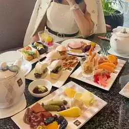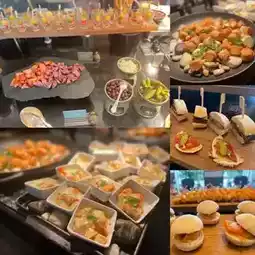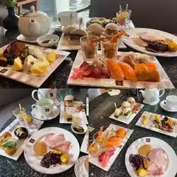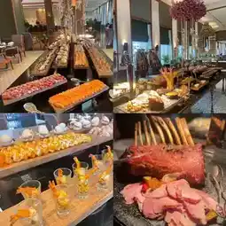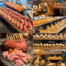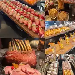 Buffet starts at 2 pm, starting with the savory line, Roasted Pork Tomahawk, soft apple sauce. Spicy shrimp and prawn salad is the highlight. Fresh fish sushi with the right taste. Coldcuts, 6 types of cheese plates, dried fruits, various breads, traditional spring rolls, dried fish watermelon, crab rolls, rice balls, shrimp with cheese, burgers, pizza, sandwiches. Oh, it's so delicious. You have to restrain yourself from getting so engrossed that there's no room for dessert.