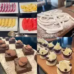 Dessert line, cakes, various chocolate snacks, scones, puddings, fruits, ice cream, totaling more than 30 items.