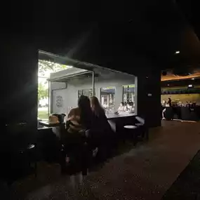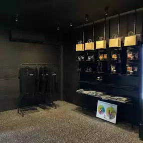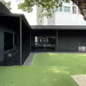 The atmosphere of the shop is decorated in a dark tone, completely black, very minimalist, looks very intriguing, haha. And contrasting with the green grass growing around the shop, it's even more beautiful.
