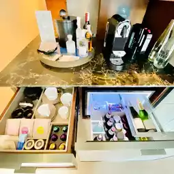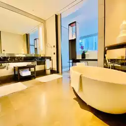 The bathroom space is about the same size as the bedroom, and the bathroom is full of taste. The double sinks and bathing accessories are from the Aqua Universalis series of French boutique perfume Maison Francis Kurkdjian. The fresh fragrance of Sicilian lemon and bergamot, and the elegant floral fragrance of lily of the valley and seven lily of the valley bloom with Moroccan roses , Egyptian jasmine and musk wood are layered, and the spacious shower room washes away the tiredness of the journey. The aroma and delicate bubbles are unforgettable for a long time, as if walking on the clouds and eternity where time is still.