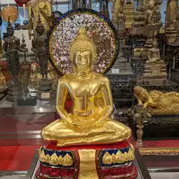 Wat Paknam in Bangkok, Thailand has a beautiful green glass pagoda, but it also has a huge golden seated Buddha, which is overwhelming in its power.