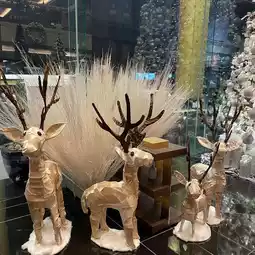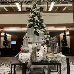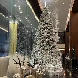 #TravelUntilCatScratches Take you to the festive season with the White Christmas team 🎄🎁❤️ Season greetings Snow ⛄️ man Waiting to welcome all honorable guests on the 1st floor and in the J w cafe restaurant area, which is decorated with silver balls and Christmas trees, decorated with gifts, prize boxes and a group of small white reindeer standing next to the Christmas tree.