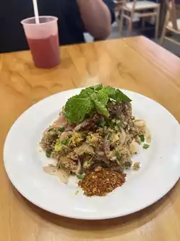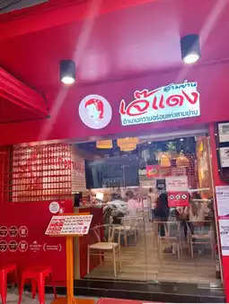 If anyone comes to Siam and doesn't know what to eat, I recommend Jay Daeng Samyan (Siam Square 10 branch) ✨ Let me tell you, it's the best. It's a som tam shop that looks super high-class 🤣 The air conditioning is so cool. ⭐️ The highlight menu that I want to recommend the most is the big set of spicy grilled pork. It's so delicious that I'm going to cry. The pork is so soft 🐽 and it's so sour and spicy.
