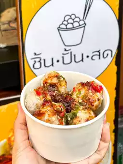 😋 Food: We recommend freshly made meatballs, very delicious, 100/10. The meatballs are made from soft, pure pork with a delicious sauce! Go, go! The watermelon smoothie is also delicious and not too expensive, 55 baht. There are many other shops to choose from.