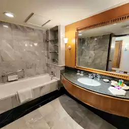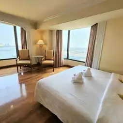This time I stayed in the Deluxe Corner room, which is 38 sq m. The bedroom plan is comfortable and the corner room has a river view on 2 sides, consisting of a King Size bed facing the beautiful view of the Rama 9 Bridge both day and night, with a work desk and a chair for sitting and relaxing.
