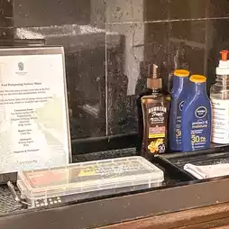 An outdoor swimming pool with staff to take care of you and bring you drinking water, sunscreen, lens cleaner, and a domino game.