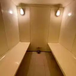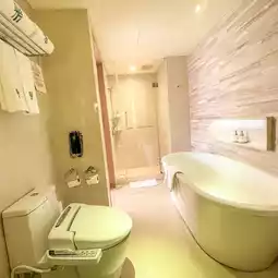 The bathroom has a double sink (with 2 faucets), an automatic electric toilet, a very large bathtub, you can comfortably soak in it, and a shower area (no rain shower).