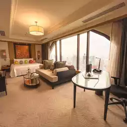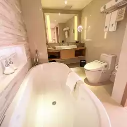 The room is on the 58th floor, the highest floor of the room zone, so you can see the city view clearly without being blocked by other buildings. The room is divided into sections, a work desk, a sofa, a small walk-in closet, a bathroom and a bed. The bed and pillows are soft and comfortable to sleep on. There are incense sticks, essential oils, and most importantly, there are electrical outlets all over the room, very convenient.