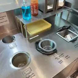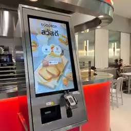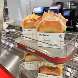 EGGDROP, the most popular egg sandwich shop, has opened at Centerpoint Siam Square. The shop is decorated in white and red tones, looking modern. You can choose to sit and eat in the shop either upstairs or downstairs. You can order through an automatic machine, choose your items, pay through the machine, wait to receive a slip, and ask for bread. The open kitchen allows you to see the food preparation, looking clean. The sandwiches are very delicious, perfect for breakfast. Another thing I really like about the shop is the clear separation of waste: water, ice, glasses, straws, and paper boxes. I have to give this a compliment.