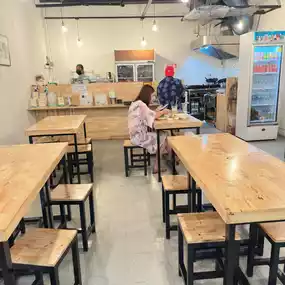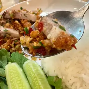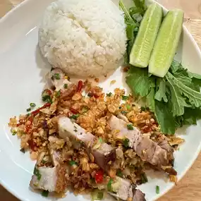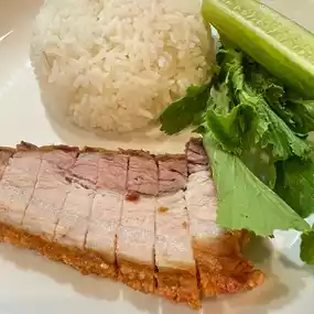 Krob Kun (ขอบกุน) is a restaurant for those who love crispy pork. The shop is located in the Art and Culture Hall. It is simply decorated and has a comfortable atmosphere. There are many tables for you to sit and eat. The shop focuses on a variety of quality food, such as large pieces of crispy pork that are made into various menus. Crispy pork lovers should not miss it, especially the crispy pork with salt and chili. It is really delicious. The aroma of garlic and roasted chili is so delicious that you have to write it down. It is a legend. The shop also provides soup and jasmine tea for every crispy pork menu.