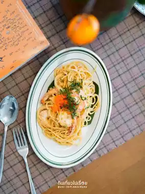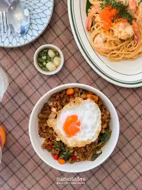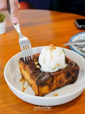 Every time I come here, there will always be a new menu. This time, I ordered spaghetti with egg and shrimp roe cream. It was fragrant and delicious. 🍝🦐 Another dish was stir-fried pork with basil and yellow chili. It was stir-fried until dry and eaten with crispy fried eggs. It was really good. 👍🏻 Finally, we had a new dessert, Roast Butter Toast. It's chocolate toast topped with juicy ice cream. It was so good and satisfying.