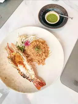 #Crispy noodles with grilled river prawns. This is the first time I have eaten crispy noodles with river prawns. It goes well together. The shrimp roe is juicy.