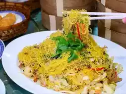 - Singapore fried noodles Stir-fried noodles with curry powder, shrimp, and red pork