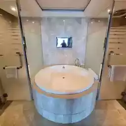 Bathroom: Prestige Suite No. xx08 will have a large round bathtub with TV. There is a His and Her sink. There is a shower and a separate toilet. And the suite will get a complete set of Hermes amenities. The scent is like perfume. When washing your hair, it smells good. Take it home as a souvenir.