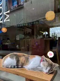After walking for a while, I arrived at the shop. There was a child welcoming me in front of the shop. I fell asleep. 🐱🐈 The shop is decorated very well. It is very cute. Plus, there are beautiful photo corners. I guarantee you will get a picture for sure. The color tones in the shop are white, brown, light green (from what I have observed) so that you can prepare an outfit to match the shop.