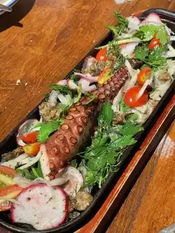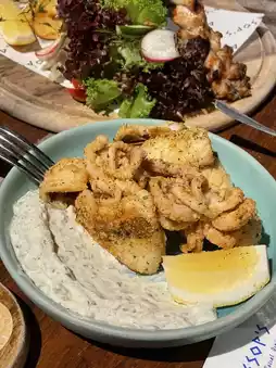 The menu that we ate and were very, very impressed with is ❤️🔥 Calamari (380.-) a very basic menu but the taste is amazing. The squid is in large pieces, fried until very crispy, and most importantly, it's not tough at all, everyone. It's not tough to the point that you'd think it wasn't squid. Squeeze lemon and dip it in the sauce that comes with it, it's awesome!