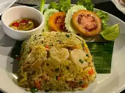 This restaurant offers both outdoor seating with a view of the Chao Phraya River and indoor air-conditioned seating.